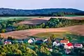Вид зі скелі Чортової на село Помоцне, воєводство Нижньосілезьке. Осінь 2019.