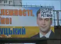 Плакат «Обережно! Партія регіонів», розміщений активістами на банері із зображенням Максима Луцького у Києві