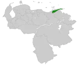 Ендемік Венесуели. Вид поширений в північних прибережних горах (штати Ансоатегі, Сукре і Монагас) і на півострові Парія напівнічному сході країни. Мешкає в підліску (до 2-3 м від землі) вологих гірських лісів з великою кількістю епіфітів на висоті від 600 до 1850 метрів над рівнем моря.