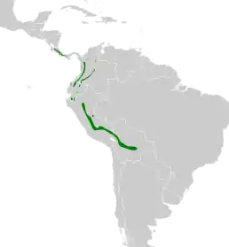Мешкає в підліску вологих гірських лісів у Болівії, Колумбії, Коста-Риці, Еквадорі, Панамі та Перу, переважно в Андах, на висоті від 800 до 2200 метрів над рівнем моря.