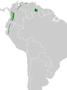 Він поширений від прибережних гір північної Венесуели, уздовж Анд Колумбії, Еквадору, північного Перу, з підвидом kukenamensis що трапляється у тепуях південно-східної Венесуели та західної Гаяни. Населяє підліски гірських лісів на висоті від 2000 до 2900 м над рівнем моря.