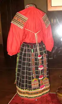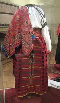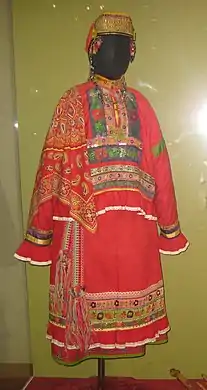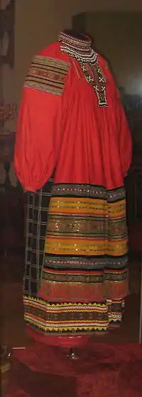 Жіночий святковий костюм: сорочка-«рукава», сорочка-«сарафанчик», поньова, фартух, пояс, намиста, головний убір сорока з 3 частин, хустка. Нижньогородська губернія, с. Починки, 1-а третина 20 ст.