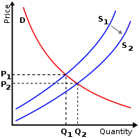 Коли витрати постачальників змінюються через чинники вказані вище, переміщується крива пропозиції. Наприклад, при покращенні засобів виробництва, виробники будуть готові забезпечувати більше товару за кожною ціною і це переміщає криву постачання S1 управо, до кривої S2 — зростання пропозиції. Це збільшення пропозиції примушує рівноважну ціну зменшитися з P1 до P2, при цьому рівноважна кількість зростає з Q1 до Q2, оскільки кількість, яка може бути продана, збільшується за новими нижчими цінами. Відмітьте, що у разі переміщення кривої постачання, рівноважна ціна і кількість рухаються у протилежних напрямках.
