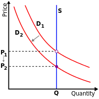 З іншого боку, якщо попит зменшується, трапляється протилежний результат. Якщо початкова крива попиту D2, а потім зменшується до D1, ціна зменшиться, і необхідна кількість товару також зменшиться — викликається скорочення в постачанні. Відмітьте, що це виключно ефект змін у попиті. Кількість, що забезпечується за кожною ціною, така ж сама як і до переміщення попиту. Причина зміни ціни в тому, що рівноважна кількість і ціна змінюється, якщо змінюється попит.