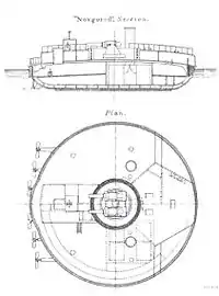Корпус поповки в верхньому плані був круглий, гармати містились в центрі на поворотній платформі. Корабель був оснащений 6 гребними гвинтами.