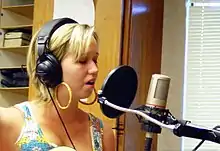 Поп-фільтр (великий чорний диск) використовується під час звукозапису.