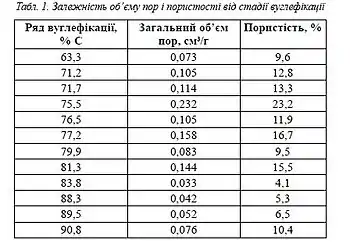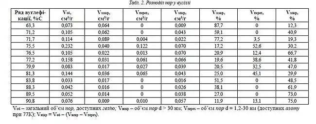 Пористість вугілля низького ступеня вуглефікації (вміст вуглецю нижчий 77 %) головним чином обумовлюється макропорами. Для вугілля з вмістом С 76-84 % близько 80 % об’єму пор припадає на перехідні та макропори. У вугіллі з більш високим вмістом вуглецю переважають мікропори. В табл. 1 та 2 подані характеристики пористого середовища вугілля різних ступенів вуглефікації.