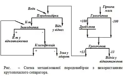 Механізація породовибірки здійснюється на шахтах і розрізах з застосуванням сепараторів КНС. Відповідно зі схемою (рис.) гірнича маса надходить на попереднє грохочення по крупності 100 мм на грохоті інерційного типу (напр., ГІТ-71).