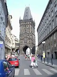 Вежа з брамою в міській стіні Праги, одна з 13 брам празького Старого Міста, існувала на цьому місці з кінця XIII ст. Значення цієї брами зросло наприкінці XIV ст., коли в безпосередній близькості від неї король Вацлав IV побудував Королівський Двір (зараз на цьому місці стоїть Громадський будинок). У 1475 році на місці старої вежі за наказом короля Владислава Ягеллонського і за проектом архітектора Матея Рейсека почалося будівництво нової брами. За взірець була взята староміська передмостова вежа на Карловому мості.