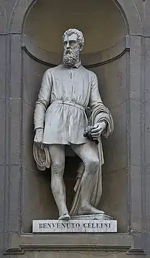 Архітектор Джорджо Вазарі та його наступник Бернардо Буонтолетті (Bernardo Buontoletti ) залишили 28 порожніх ніш у стінах колонади палацу Уффіці. Портрет Бенвенуто Челліні, виконаний Уліссе Камбі (1807-1896), був поміщений в одну з ніш. Мармурова статуя більш 3 метрів заввишки була представлена громадськості 24 червня 1845 року.