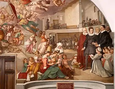 Збереглася фреска художника Бернардино Рочетті (1542—1612) зі сценами життя шпиталю для покинутих дітей. Художник розповідає картиною увесь шлях позашлюбних дітей — ліворуч панель, де залишали небажаних і позашлюбних немовлят, служниць, що вносять немовлят, годують і доглядають в благодійному закладі. Зверху — дві сцени виховання і навчання сиріт під наглядом вчителя-ментора з лозиною для покарань неслухняних. Головне місце — відведене для комісії вельможних патронів закладу(груповий портрет), що відвідали благодійний заклад.