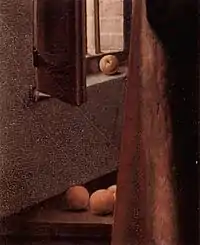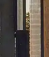 ![]() У дзеркалі видно балки стелі, друге вікно та дві постаті, що входять в кімнату. Поруч висить вервиця | |