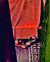 | Взуття | Наречений зображений босоніж на дерев'яній долівці, його дерев'яні сабо валяються поруч. Ноги нареченої прикриті сукнею, але на задньому плані поруч з ліжком видно другу пару взуття..