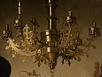 За іншою версією, запалені свічки в люстрі — це весільні свічки, які цитують традиційну іконографію Благовіщення. Це підкреслює Богородичний характер живопису. Адресований в першу чергу жінкам, культ діви Марії був суттєвим фактором подружньої моралі в XV столітті[4]. |