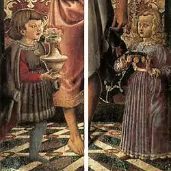 Особливо полюбляли вставляти «приховані» портрети в зображення Поклоніння волхвів: тема ритуального підношення трьох царів асоціювалася з темою донаторства. У другій пол. XV століття воно стане одним з найулюбленіших сюжетів флорентійців, додатково, і тому, що Медічі влаштовували пишні театралізовані вистави на цю тему. Джентіле да Фабріано поклав початок цієї традиції (1423, Уффіці), створивши зразок на замовлення того ж Палла Строцці. У натовпі він написав самого себе (за словами Вазарі). Пропонуються версії з упізнання замовника і його синів, але обличчя персонажів поки ще стереотипні і неіндивідуальні. Мазаччо на ту ж тему (Берлін, 1426, розрізнений «Пізанський поліптих») більш індивідуалізований — дві фігури можуть бути зображеннями замовника нотаріуса Джуліано ді Коліно дельї Скарсі та його близького. Але для вівтарної картини знадобиться ще час, щоб портретні натяки стали незаперечними.
