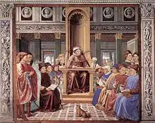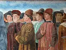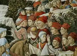 Беноццо Гоццолі зі своїми розписами у Капелі волхвів (Палаццо Медічі-Ріккарді, 1459–1460), більш консервативний, у ньому більше тенденцій до барвистої інтернаціональної готики. Він відтворює новаторський тепер реалізм в стилі і обличчях, але при цьому зберігає декоративний ефект розпису і казкову лицарність. Листи свідчать, що художник беззаперечно слухався замовника, П'єро Медічі. Розписи покривають всі стіни суцільним килимом, вони задумані не як цикл фресок, а як єдина декорація, що безперервно розгортається по стінах капели. Всього зображено близько 150 фігур. Коли сім'я Медічі відвідувала капелу, вона бачила на стінах знайомі обличчя і знайомі краєвиди. Гращенков вважає, що реальні портрети зосереджені тільки в 2 місцях: групі вершників на чолі з П'єро Медічі і групі фігур в червоних шапках на протилежній стіні в «Ходи Старого волхва». Цим зображенням властиві композиційна і ритмічна неузгодженість, різнобій за масштабом — це є результатом того, що ці голови повторюють окремі портретні замальовки, зроблені з натури поза прив'язкою до композиції фрески. Особливо хаотичні голови у другій групі — вони звернені в різні боки, втиснуті в пейзаж без усякого взаємного зв'язку і механічно заповнюють простір за принципом «куди вдалося вставити». У цій «мозаїці» очевидна безпорадність Гоццолі в питанні композиції, оскільки він відмовився від ренесансного принципу перспективно-просторової єдності частин в цілому і втратив можливість створити зв'язну портретну групу. Кожна з зображених ним голів при цьому, взята окремо, демонструє його майстерність у натуралістичній передачі обличчя, його вправність у зображенні голови в різних поворотах і ракурсах. Ці фрески — «запізніла квітка лицарської культури», в який включені реалістичні портрети, що знаходяться в дисонансі з святковою готикою стилю зображень.