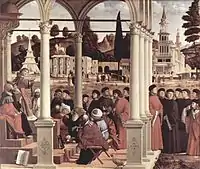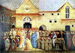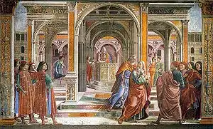 Новаторська роль в цьому питанні знову належала Мазаччо, який в церкві Санта Марія дель Карміне (Флоренція) написав фреску на сюжет урочистого освячення цього храму архієпископом Амеріго Корсіні, що мало місце в квітні 1422 року. Фреска, що знаходилася на монастирському подвір'ї на стіні над входом і не збереглася до наших днів, була виконана монохромно («зеленою землею»). Вазарі повідомляє про незліченну кількість зображених там іменитих громадян міста, що слідували за процесією. Композиція реконструюється за її описом і низкою малюнків (в тому числі молодого Мікеланджело). Швидше за все, вона була схожа на «Диво з статиром» і «Воскресіння сина Теофіла» Мазаччо (Капела Бранкаччі). У центрі, мабуть, був зображений сам акт посвячення церкви, а по обидва боки — симетрично стояли фігури громадян, які розташовувалися рядами, що йдуть в глибину. Може бути, під впливом цієї фрески Гірляндайо написав «Воскресіння сина нотаріуса» (1482–1485, церква Санта Трініта), а Біччі ді Лоренцо — «Освячення шпитальної церкви Сант Еджідіо папою Мартіном V у вересні 1420» (1420–1421, Санта Марія Нуова), втім, відповідно до дат виходить, що Біччі ді Лоренцо міг написати свою роботу раніше Мазаччо. Мазаччо, на відміну від нього, представив сцену освячення не як церковний акт, а як урочисту подія з громадського життя Флоренції, перенісши акцент на портрети видатних сучасників.