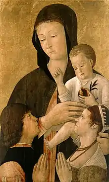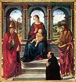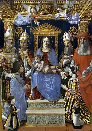 Є найбільш традиційним типом з перерахованих. Донатори зображалися уклінними і у молитві, зазвичай строго в профіль; чоловіки — по праву руку від Мадонни або святого, а жінки — по ліву; часто в супроводі своїх тезоіменних святих покровителів. Часом продовжує зберігатися середньовічна ієрархічна диспропорція між людьми і небожителями (Джентіле да Фабріано, «Мадонна зі святими», Берлін; Якопо Белліні, «Мадонна з Леонелло д'Есте», Лувр; Франческо Боттічіні, «Св. Ієронім з донаторами Ручеллаї», Лондон).