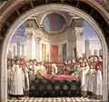 Філіппо Ліппі у своїх розписах хорів собору в Прато теж спирався на досвід фресок Сант Еджідіо. Спочатку розпис на тему житія св. Стефана та Івана Хрестителя був замовлений фра Анжеліко, але той відмовився, і Ліппі почав роботу в 1452 році, пізніше до нього приєднався його помічник фра Діаманте. Цикл був закінчений до 1465. Права стіна була прикрашена сценами з життя Хрестителя (покровителя Флоренції), а ліва — св. Стефана (початковий покровитель собору і міста Прато, яке тепер належало Флорентійській республіці). Дві фрески нижнього регістра (найпізніші) відрізняються художньої зрілістю: це «Бенкет Ірода» і «Богослужіння над останками св. Стефана». У другій фресці очевидний вже сформований тип композиції монументального групового портрета, що вже визначив подальший розвиток цього жанру в церковному живописі Раннього Відродження. У фресці налічується понад десять портретних фігур, причому вони складають важливу частину композицію. Початковий задум (зберігся ескіз, Клівленд), не припускав такої кількості фігур. Фігури повні спокійної гідності, простір трактовано з тілесністю, пластика виявлена. Вся побудова фрески, без сумніву, була підказана майстру «Освяченням» Мазаччо. Зображені члени міської комуни і опікунства собору. Фігура в червоному в центрі правої групи — можливо, папа Пій II, а фігура в лівій групі з молитовником — можливо Донато Медічі, єпископ Пістойї і Прато; нерозпізнаним залишається Карло Медічі.