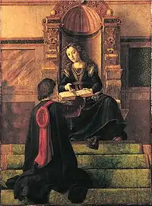 Вітторе Карпаччо оригінально вирішив цю задачу, він по-своєму перетлумачив композицію традиційного «Поклоніння немопляті» (1505, фонд Гульбенкяна): донатори вклоняються Христу в одній емоційній площині зі Святим Сімейством, замінивши євангельських пастухів. Донатори стають вже не глядачами, а співучасниками події.