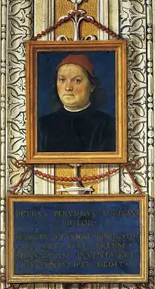 Перуджино у 1497–1500 розписував приймальний зал Колледжо дель Камбіо (Перуджа) євангельськими сюжетами, алегоріями і гротескними орнаментами. На орнаментованій пілястрі він написав автопортрет, імітуючи станкову картину, що висить на ланцюжку. Під він розмістив латинський напис: «Петро — чудовий перуджинський живописець. Що загубило мистецтво, знову відродив він, малюючи. Те, чого не було в ньому, заново він винайшов. Рік 1500». Пінтуріккіо повторить цей експеримент (1500–1501, капела Троїло Бальйоні, ц. Санта-Марія-Маджоре, м. Спелло) у фресці «Благовіщення», де його «портрет» буде «висіти» на стіні і буде оточений ілюзорними обманками.