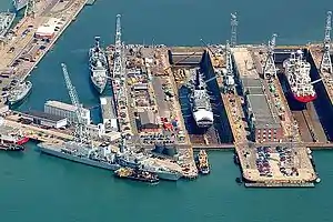 ![]() ВМБ Портсмут з висоти пташиного польоту. На передньому плані парадна стінка і пришвартований до неї легкий авіаносець HMS Illustrious (R06) | ||||
