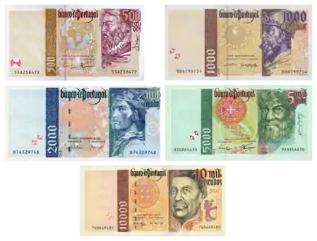 На час переходу на Євро в обігу були банкноти номіналом 500, 1000, 2000, 5000 та 10 000 ескудо. На банкнотах зображалися видатні особистості з історії Португалії. Остання серія мала зображення особистостей Епохи великих географічних відкриттів, таких як Жоау Де Баррос, Педру Альвареш Кабрал, Бартоломеу Діаш, Васко да Гама та Енріке Мореплавець.