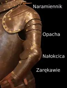 - наплічник, опаха (англ. rerebrace, upper cannon, пол. opacha)— частина обладунку, що захищає верхню частину руки (плече).