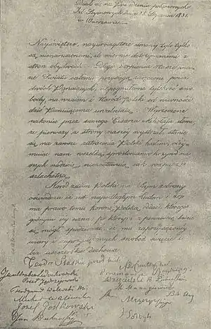Після маніфестації у Варшаві та невдалої місії проросійського міністра Ксаверія Друцького-Любецького в Санкт-Петербург 25 січня 1831 року польський Сейм прийняв постанову про детронізацію Миколи I.
