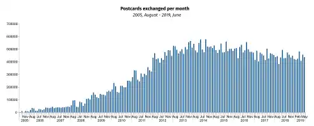 590 000 людей із 212 країн, в; за годину пересилається більше 1200 листівок[3].