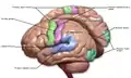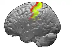 ![]() Поля Бродмана 3, 1 and 2. Поле Бродмана 3 позначено червоним, поле 1 зеленим, і поле 2 жовтим. | |