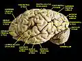 Вид людського мозку, основні звивини з написом.
