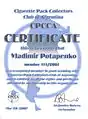 Сертифікат члена Міжнародного Клубу Колекціонерів Сигарет