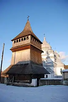 - Дзвіниця Троїцької церкви (1593 рік) — Дерев'яна, каркасна, квадратна в плані, завершена високою шатровою покрівлею, під якою розміщена ажурна аркада. Низ дзвіниці оперезаний піддашшям великого виносу, який підтримується приставними кронштейнами. Споруда, яка досягає висоти 20 м, відрізняється монументальністю і строгістю архітектурних форм. Належить до видатних пам'яток народної дерев'яної архітектури.