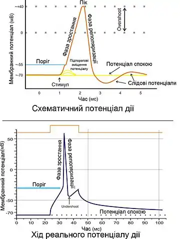 - 'Мембрана збудливої клітини здатна швидко змінювати свою проникність' для певного виду катіонів, викликаючи перехід позитивного заряду з зовнішньої сторони на внутрішню