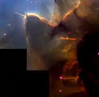 - Стовпи й струмені в Потрійній туманності (фото телескопа ім. Хаббла)