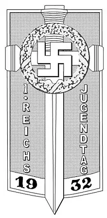 Значок виготовлявся з бронзи або латуні і мав форму прямокутного щита з заокругленим нижнім краєм, на який накладено меч. Посередині рукойтки меча — свастика, оточена вінком з лаврового листя. Кінчик меча трішки виступає над щитом. Зліва від леза — напис 1. REICHS (ПЕРШИЙ ІМПЕРСЬКИЙ), справа — продовження JUGENDTAG (ДЕНЬ МОЛОДІ). Внизу — рік (1932), число розділене лезом. Максимальна довжина знака (довжина меча) — 48.5 мм, ширина — 22.5 мм.