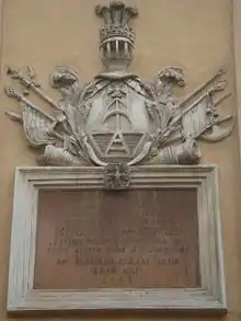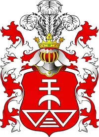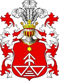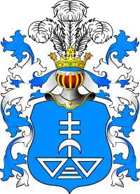На щиті дворянський коронований шолом. Нашоломник: три страусових пера. Намет на щиті червлений, підкладений сріблом.