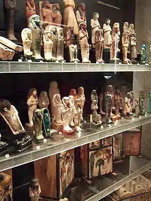 У ранніх царських гробницях були знайдені останки людей принесених в жертву. Подібні знахідки лише зміцнили думку археологів в тому, що у кожного єгиптянина повинна була бути важлива функція після смерті. Можливо ці люди, були покликані служити вічно своєму цареві. Надалі, необхідність у вчиненні людських жертвоприношень відпала, ймовірно з тієї причини, що фараони знайшли більш гарну і гуманну альтернативу у вигляді магічних фігурок і настінних розписів з заклинаннями.[10] Деякі з цих фігурок, були створені схожими на певних людей, щоб вони могли і після смерті слідувати за фараоном.