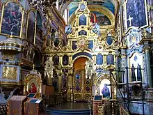 - над Царськими вратами, в зіркоподібному, сяючому різнокольоровими каменями кіоті — чудотворна Почаївська Ікона Богородиці — друга Лаврська святиня, яку подарував 1559 року грецький митрополит Неофіт місцевій поміщиці Ганні Гойській.