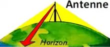 Однак на частотах вище 30 МГц (УКВ і вище) та на нижчих рівнях атмосфери, жоден із цих ефектів не є суттєвим. Таким чином, будь-яка перешкода між передавальною антеною (передавачем) і приймальною антеною (приймачем) буде блокувати сигнал, як і світло, яке може відчувати око. Отже, оскільки здатність візуально бачити передавальну антену (нехтуючи обмеженнями роздільної здатності ока) приблизно відповідає здатності приймати від неї радіосигнал, характеристика поширення на цих частотах називається «пряма видимість». Найдальша можлива точка поширення називається "радіо горизонтом".