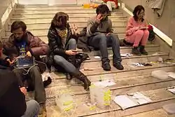 | Ми просто кожного вечора збиралися, тому, що там з'являлось особливе натхнення. Ми не знали, чим все це закінчиться, як довго ми будемо всім цим займатися, ми просто приходили, застеляли на східці старі поношені речі, сиділи, та обмірковували. Хто паяв скриньки, хтось писав індекси, назви наметів і робив малюнки, які б позначали цей намет, хтось в'язав мотузки на скриньки, а хтось просто грав на гітарі. І на останньому метро ми їхали додому чи залишались на Майдані. І так кожного вечора. Це був чудовий час |