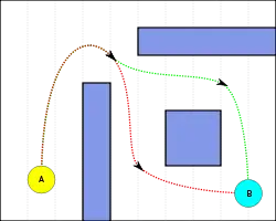 - Планування шляху з довільними кутами — це сім'я алгоритмів для планування шляхів, які не обмежуються рухатися уздовж країв у графічному пошуковому рядку, розроблені таким чином, щоб мати можливість приймати будь-який кут і таким чином знаходити більш короткі і прямі шляхи