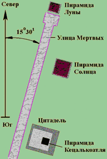 Як єгипетські піраміди, так і піраміди Теотіуакана разом із храмом Кетцалькоатля повторюють розташування зір Поясу Оріона. Зорі Альнітак відповідає храм, зорі Альнілам - Піраміда Сонця, а зорі Мінтака - Піраміда Місяця. Як пише Олександр Іванов, "Дорога мертвих", що починається біля підніжжя Піраміди Місяця й тягнеться майже у напрямку півдня (див. мал.) відповідала небесному екватору й мала напрямок захід-схід. теперішню "неправильну" орієнтацію він пояснює рухами земної кори, до того ж північний полюс Землі був у Тихому океані. Але загалом розташування пірамід Теотіуакана не дуже точно відповідає розташування зір Поясу Оріона. Пряма, що проходить через Альнілам та Мінтаку на небі відхиляється від прямої, що проходить через Альнітак та Альнілам на приблизно 7°. Для пірамід цей кут становить близько 14°[5]. Іванов пояснює, що раніше розташування зір було іншим, адже необхідно врахувати власний рух зір, що може дозволити уточнити час зведення пірамід [6].