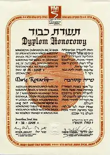 Згідно із законом Яд Вашем уповноважений «надавати почесне громадянство Праведникам народів світу на знак визнання їхніх дій, а якщо вони померли, пам'ятне громадянство держави Ізраїль». Кожний, визнаний Праведником народів світу, має право на сертифікат від Яд Вашему. У разі його смерті, його найближчому родичу надається право на визнання пам'ятного громадянства за померлим. Одержувачі, що вирішили жити в Ізраїлі, отримують пенсію у розмірі середньої заробітної платні, безплатне медичне обслуговування, а також допомогу у веденні господарства та медичному догляді.