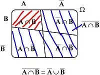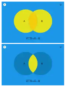 які графічно представлені ілюстраціями нижче. Дано дві множини A і В, які є підмножинами Ω (універсуму). Діаграма 1 показує їх розташування відносно одна до одної. У діаграмі 2 показано, як формується . У діаграмі 3 на прикладі можна побачити що обидві множини рівні.