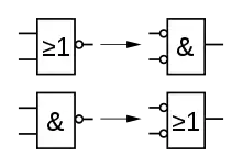 В обох цих формулах — логічна диз'юнкція, — логічна кон'юнкція, — логічне заперечення (негація), p, q — деякі логічні висловлення.