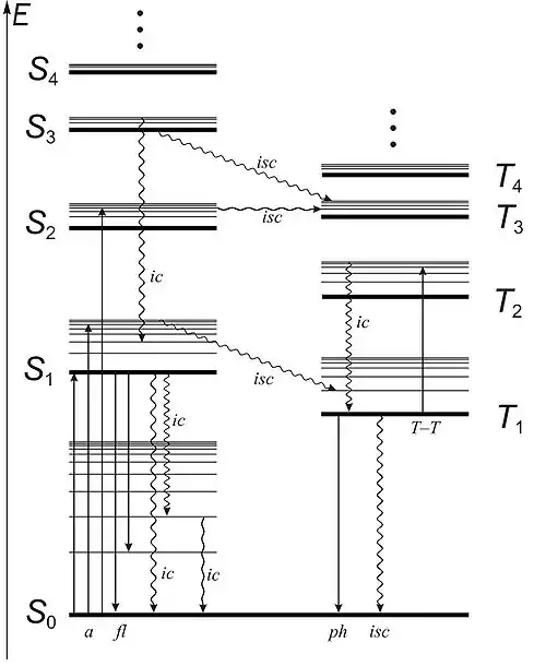 На діаграмі показано послідовності перших синглетних та триплетних станів з їхніми коливальними підрівнями. Прямими стрілками позначено випромінювальні переходи, хвилястими — невипромінювальні. Перші три стрілки зліва (спрямовані догори й позначені літерою a) означають поглинання світла; стрілки, позначені fl,— флюоресценцію, стрілки, позначені ph,— фосфоресценцію. Докладніше про позначення див. у статті Діаграма Яблонського.