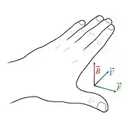 Якщо розташувати ліву долоню так, щоб витягнуті пальці збігалися з напрямом струму, а силові лінії магнітного поля входили в долоню, то відставлений перпендикулярно великий палець вкаже напрям сили, що діє на провідник.