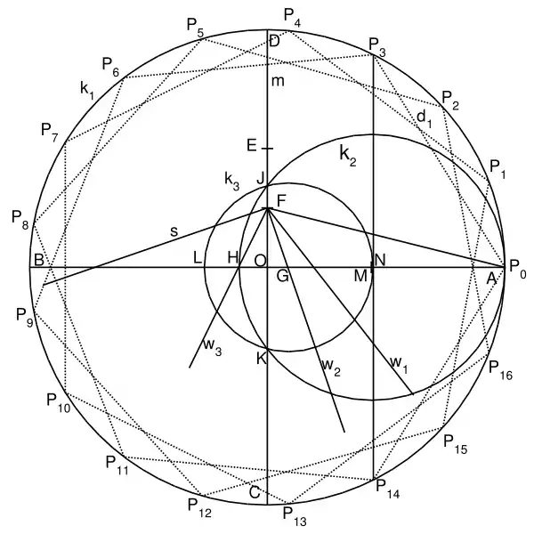 Точки перетину цієї дотичної до вихідного кола k₁ — це точки P₃ та P₁₄ шуканого сімнадцятикутника. Якщо прийняти середину отриманої дуги за P₀ та відкласти дугу P₀P₁₄ по колу тричі, усі вершини сімнадцятикутника будуть побудовані.